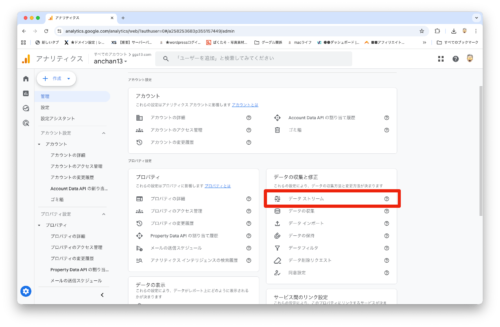 右に表示された「データの収集と修正」からデータストリームをクリックします。