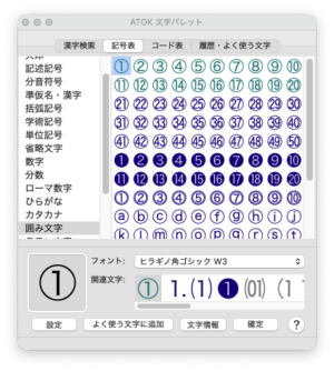 文字パレットは、なにげによく使います。丸数字や記号などを選ぶときに重宝します。