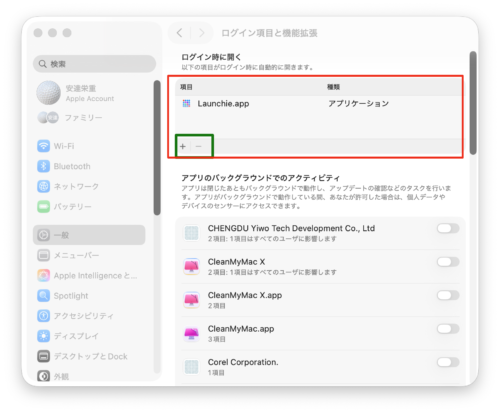 macが起動したときにアプリを起動する設定手順とアプリの起動を止める設定手順 サイト内検索 mac初心者向けmacの使い方チャンネル 2025.10.31 この記事は約1分で読めます。 こんにちは。 macライフのあんちゃん13です。 スポンサーリンク >システム設定>一般>ログイン項目と機能拡張 ログイン時に開くの中に表示されているアプリがmacが起動したときに起動するアプリです。 追加する場合は、緑枠個所の「+」をクリックして起動するアプリを選択します。 逆に、acが起動したときに起動するアプリを止めたいときは、表示されているアプリを選択して「ー」をクリックします。 関連記事 macが起動した時にアプリを立ち上げないようにする設定手順 スポンサーリンク Bluesky
