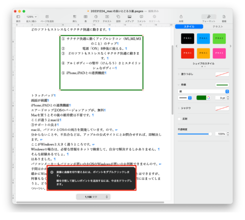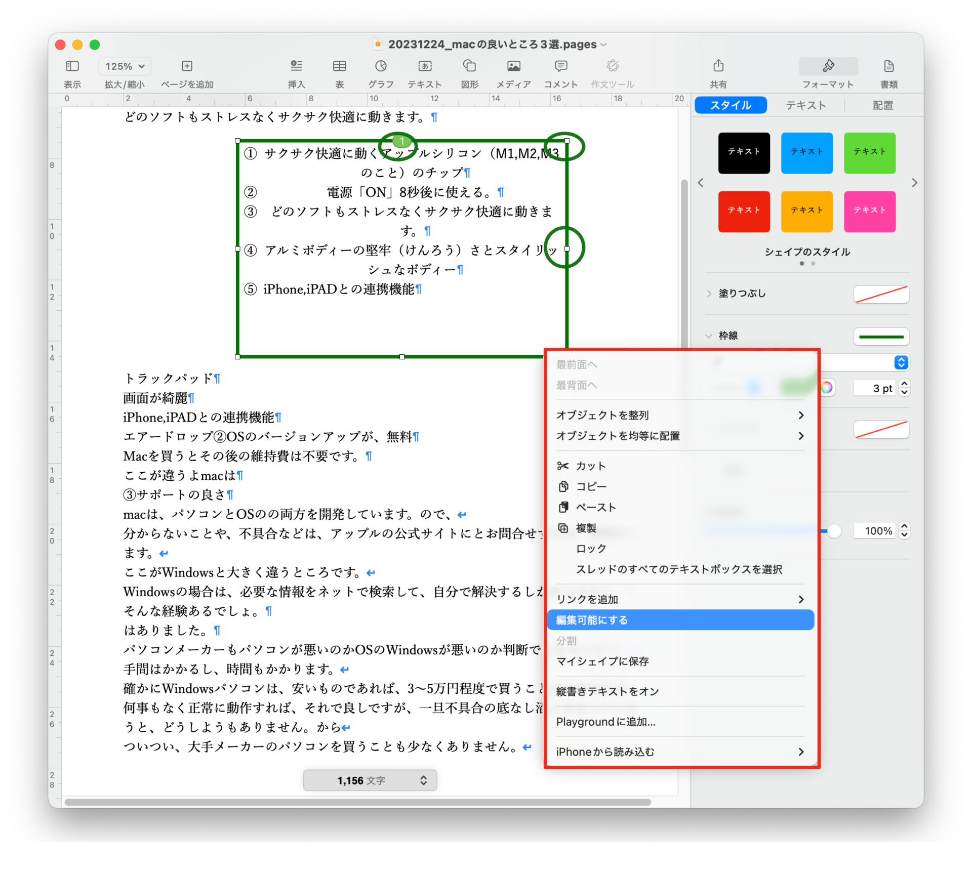 macのPagesページズの使い方㉑Pagesページズでオブジェクトを編集する サイト内検索 pages 2025.10.13 この記事は約1分で読めます。 こんにちは。 macライフのあんちゃん13です。 acのPagesページズは、貼り付けた図形やテキストボックスなどのオブジェクトの形を自由に変更することができます。 オブジェクトを選択して右クリックをします。表示されたメニューから「編集可能にする」をクリックします。 するとオブジェクトに◻︎ポイントが表示されますので、ポイントをドラッグして、オブジェクトの形を変更します。 ポイントをダブルクリックすると曲線で形を変更できるようになります。 Bluesky
