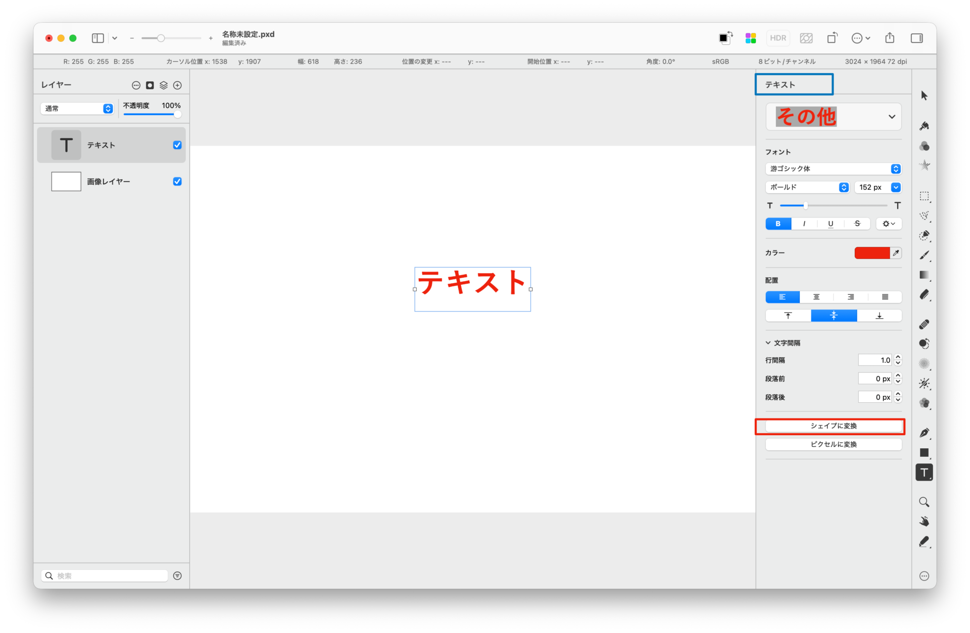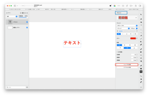 その状態で、画面右下にある「シェイプに変換」赤枠個所をクリックします。