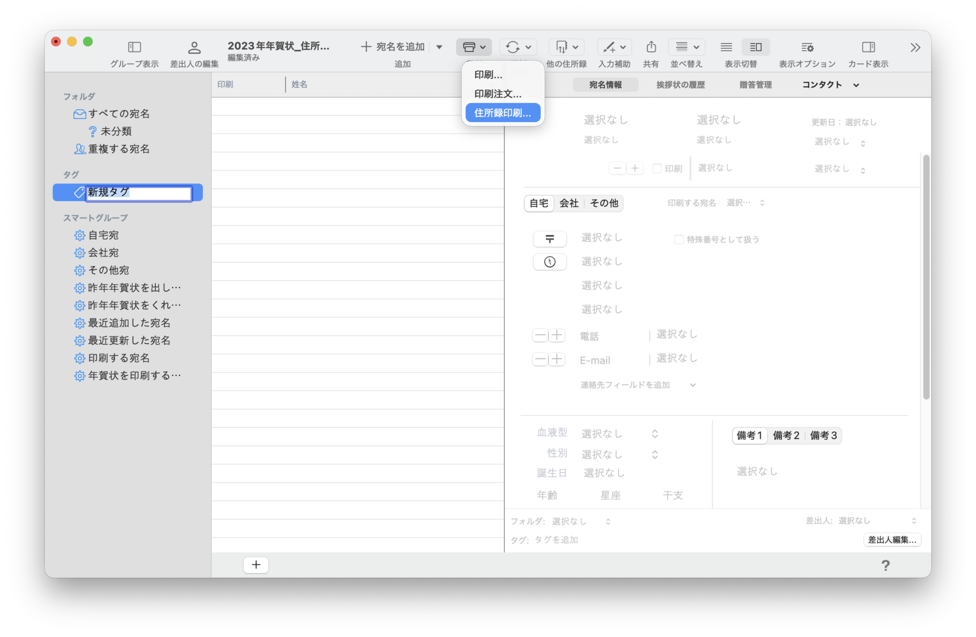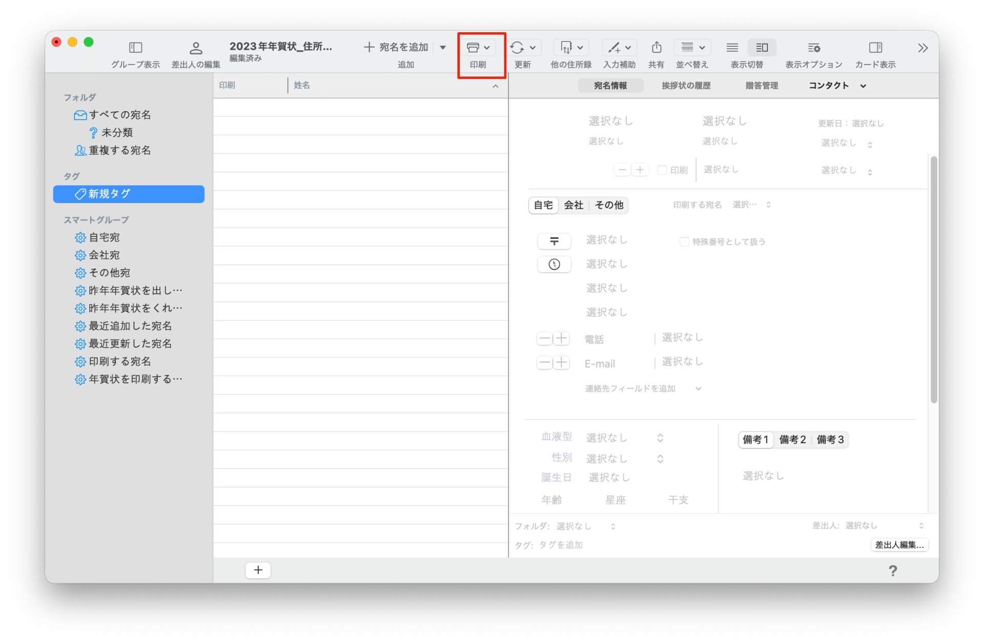 macの年賀状ソフト宛名職人の使い方②macの年賀状ソフト宛名職人で住所録を印刷する手順 サイト内検索 宛名職人 2025.11.08 この記事は約1分で読めます。 こんにちは。 macライフのあんちゃん13です。 自称宛名職人のアンバサダーのあんちゃん13です。 スポンサーリンク 宛名職人の住所録を起動します。印刷アイコン赤枠個所をクリックします。 このアイコンです。 印刷メニューが表示されますので、住所録をクリックします。 住所録印刷画面が表示されますので、印刷ボタンをクリックします。 印刷メニューで印刷をクリックするとスタートパネルが開きます。 Bluesky