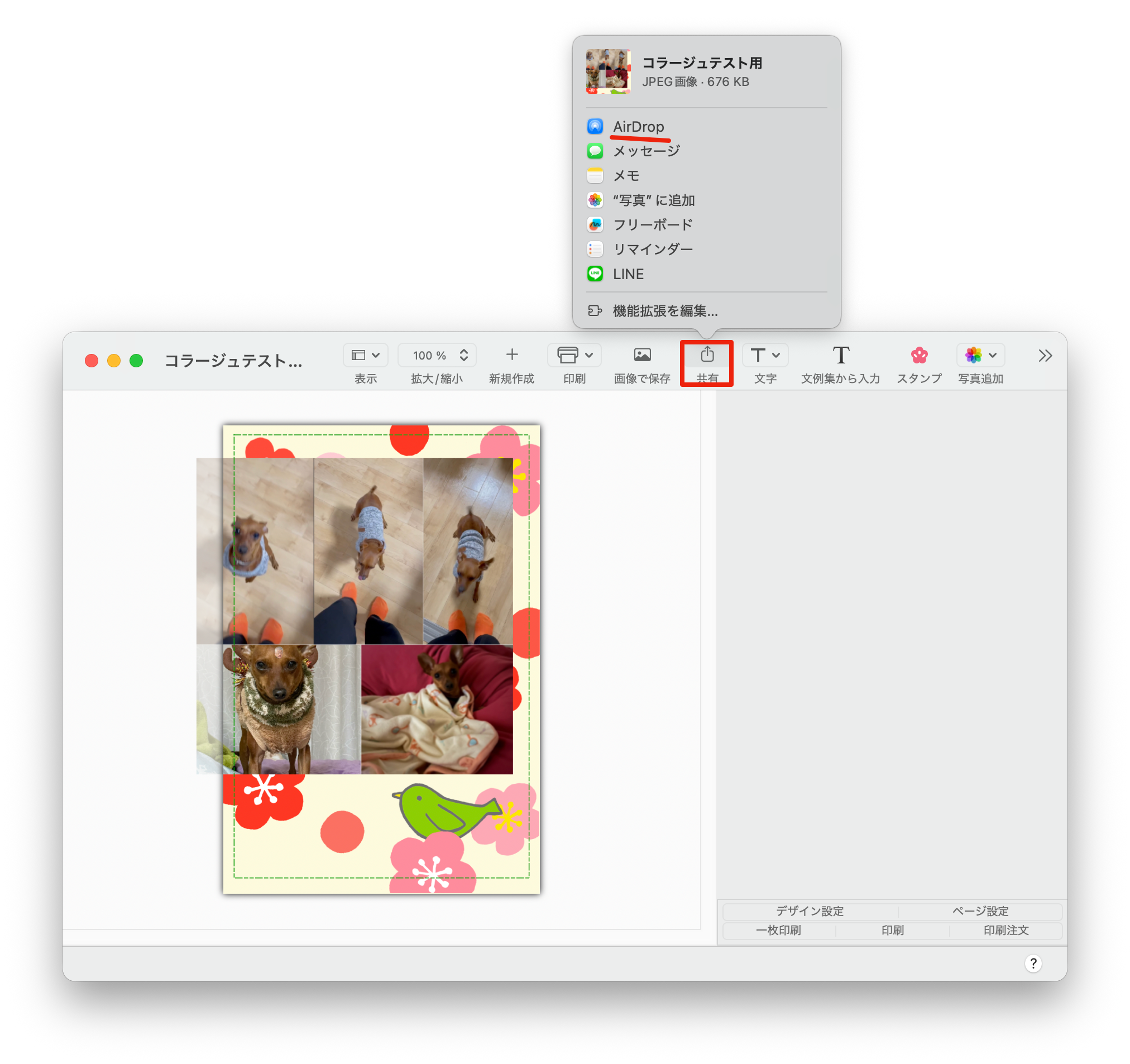 デザイン作成画面の上部に「共有アイコン」があります。AirDropをクリックして、iPhoneを選べば、iPhoneの写真アプリ内にデザインの画像が送られます。