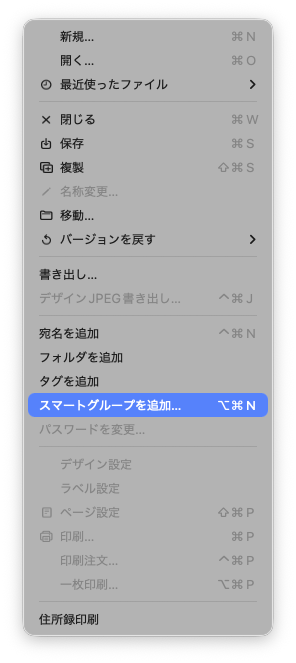 メニュー>宛名職人>スマートグループを追加をクリックします。