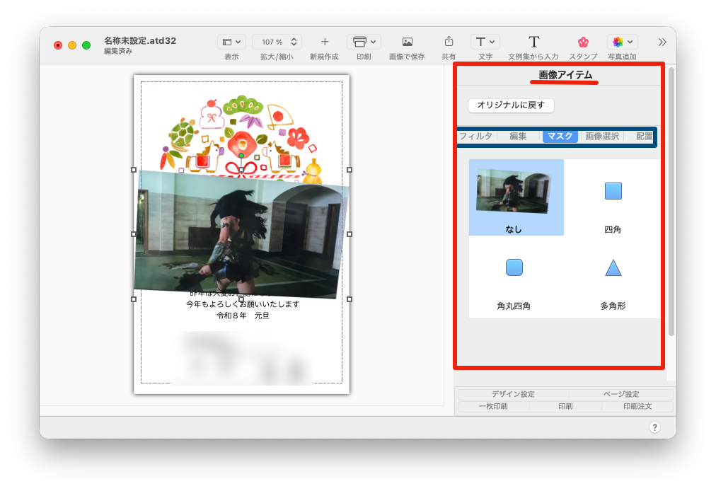 macの年賀状ソフト宛名職人の使い方⑥macの年賀状ソフト宛名職人で年賀状裏面に画像を追加してマスクする手順