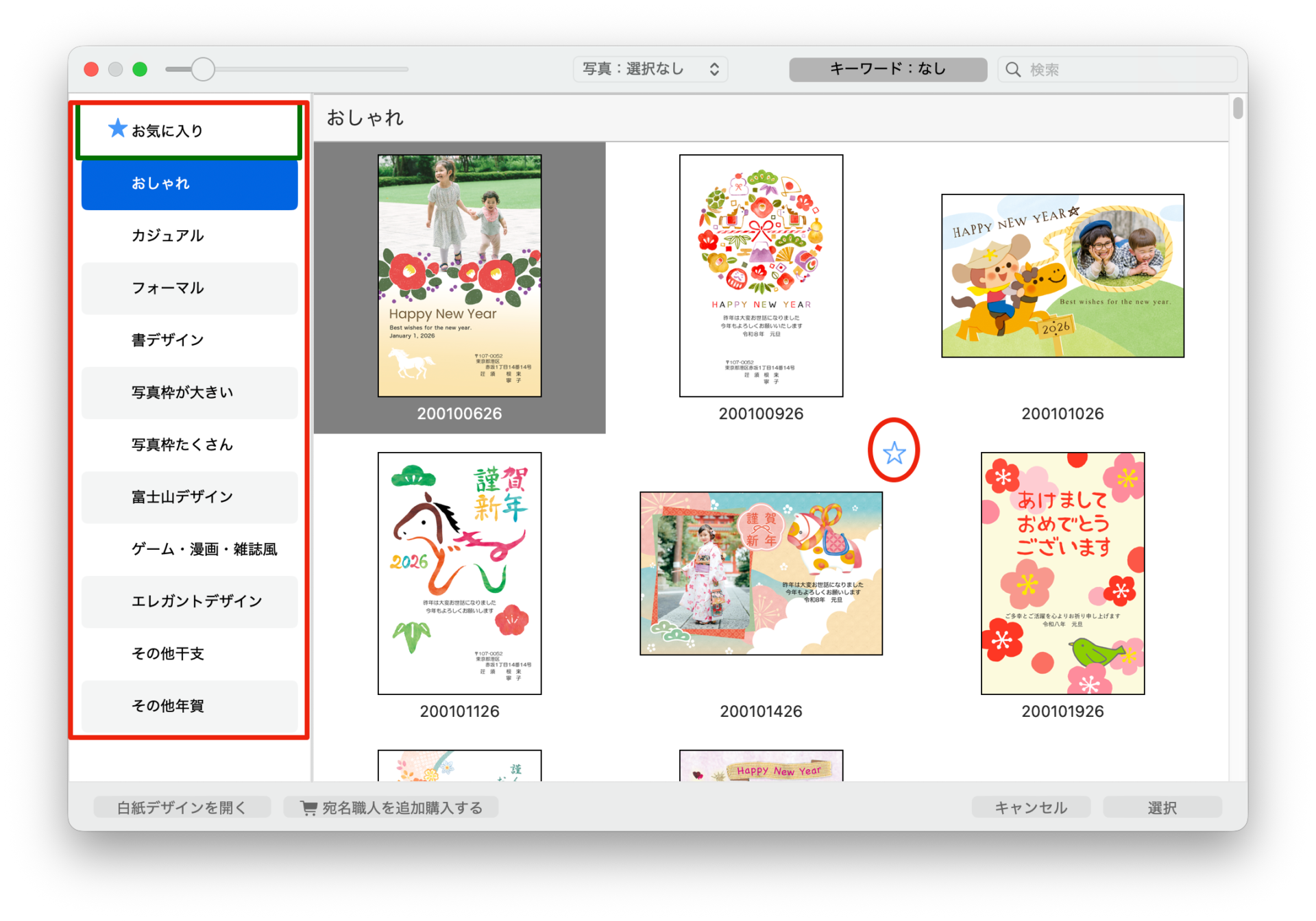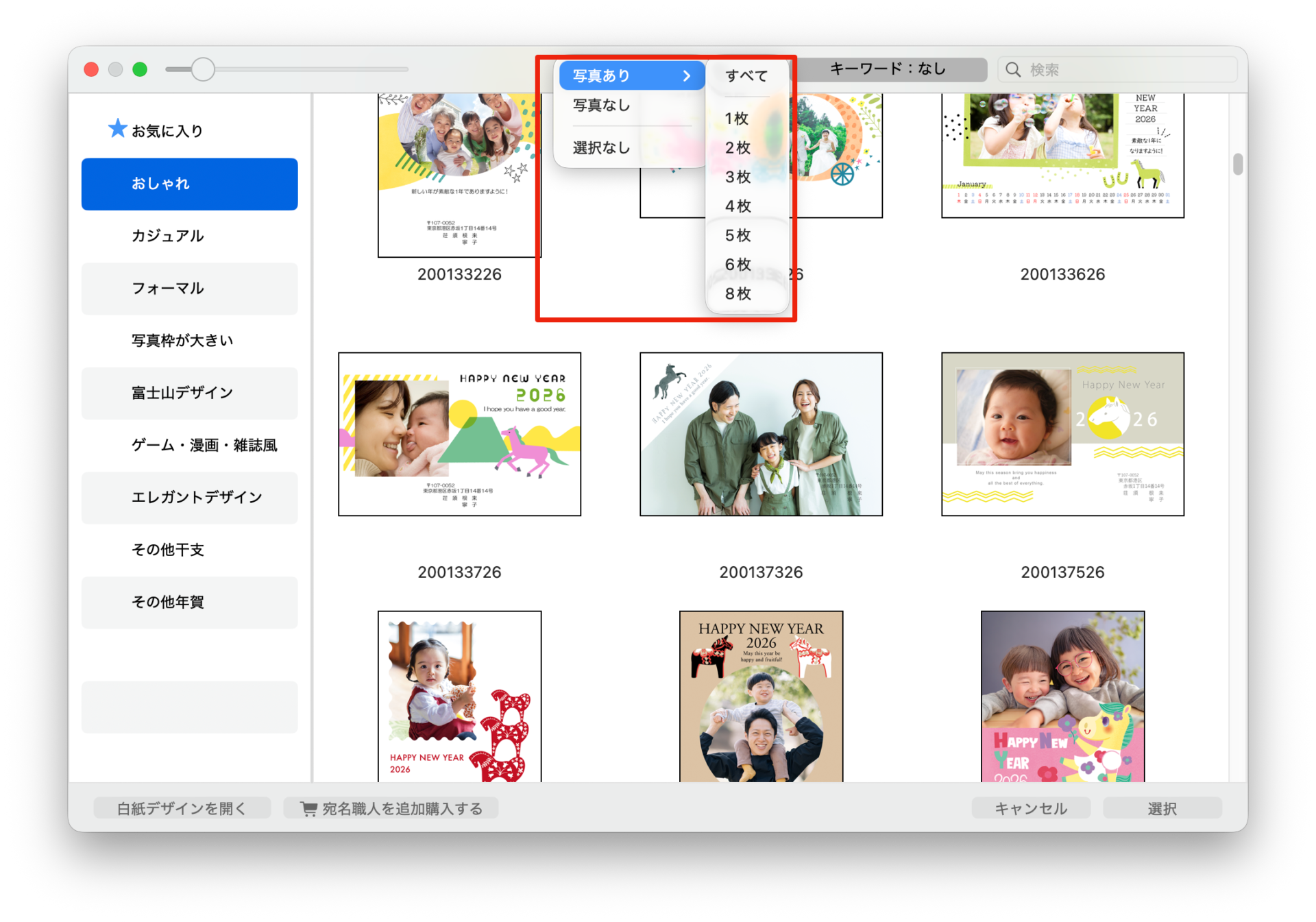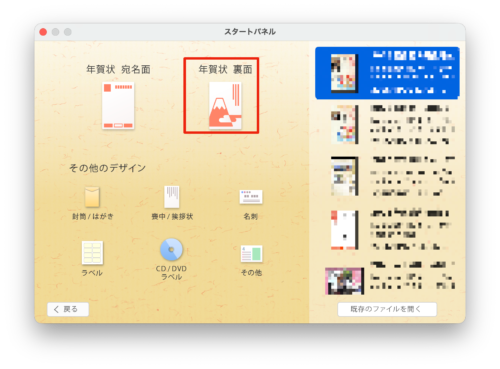 macの宛名職人で年賀状の裏面デザインを検索するには、ソフト内のデザイン素材ライブラリを使用するか、自分で作成した画像ファイルを読み込む方法があります。具体的には、「デザイン」メニューからお好みのデザインを探したり、「イラスト・画像ファイルの選択」から写真やイラストを挿入したりして、デザインを作成・検索します。