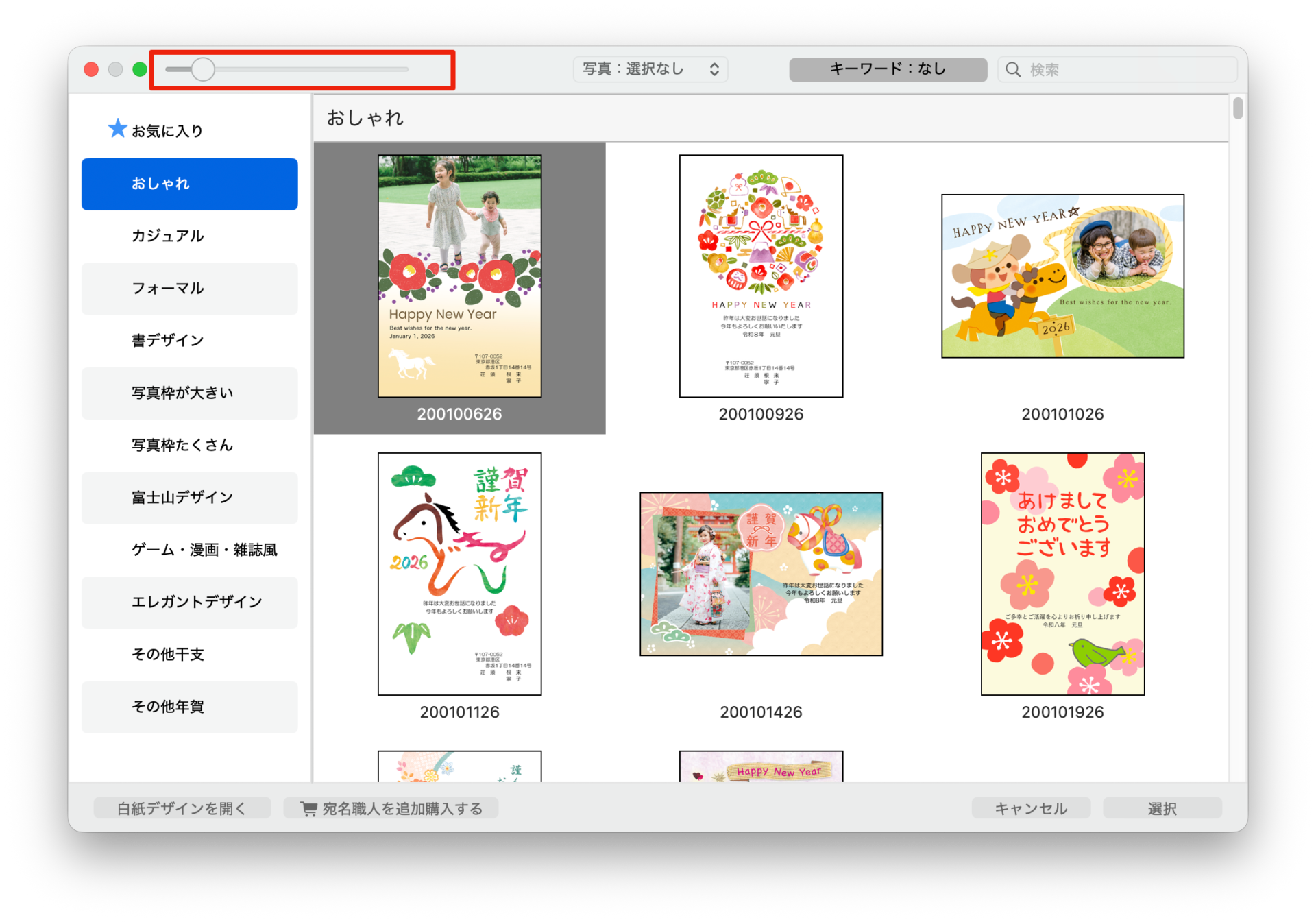 赤枠個所のレバーを右にスライドすると表示されているデザインの表示が大きくなります。