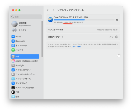 システム設定を開いてみるとソフトウェアアップデートがあったので、手動でアップデートしました。