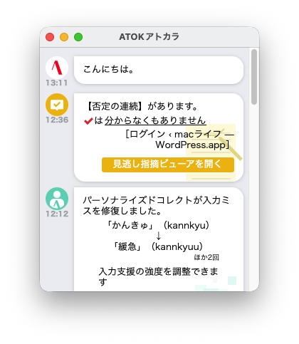 ATOKエイトックパレットに赤い●が表示されたら何らかの通知メッセージがありますクリックして確認しましょう サイト内検索 日本語入力 2025.10.18 この記事は約1分で読めます。 こんにちは。 macライフのあんちゃん13です。 ご覧のような赤い●です。 今回は、以下の内容でした。 あえて、二重否定の表現にしました。 ATOKエイトックパレットに赤い●が表示されたら、クリックして確認すると良いでしょう。 Bluesky
