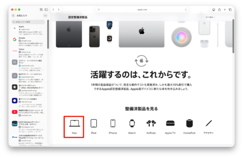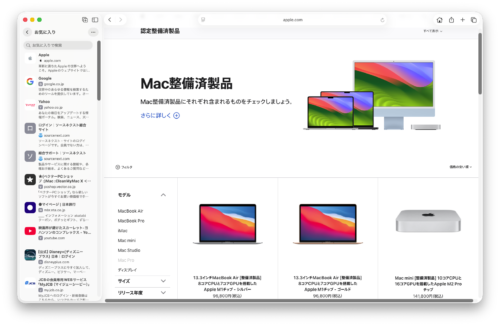 macの認定整備済み製品が表示されます。気になる製品をクリックすると製品仕様(メモリ容量、SSDの容量など)が表示されます。