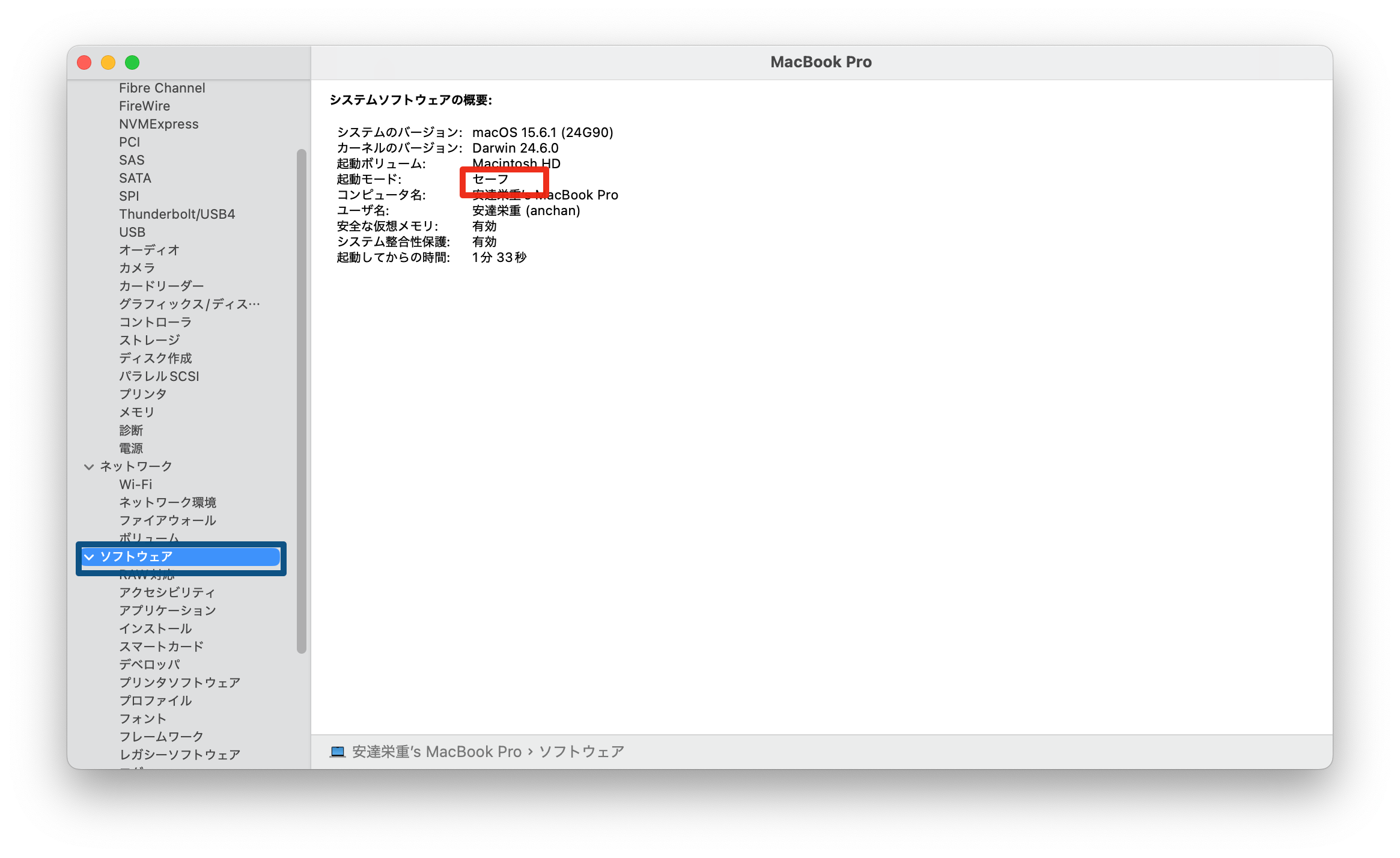 「MacintoshHD」をクリックして「Shift」キーを押すと「MacintoshHD」下が「セーフモードで続ける」の表示赤枠個所になります。