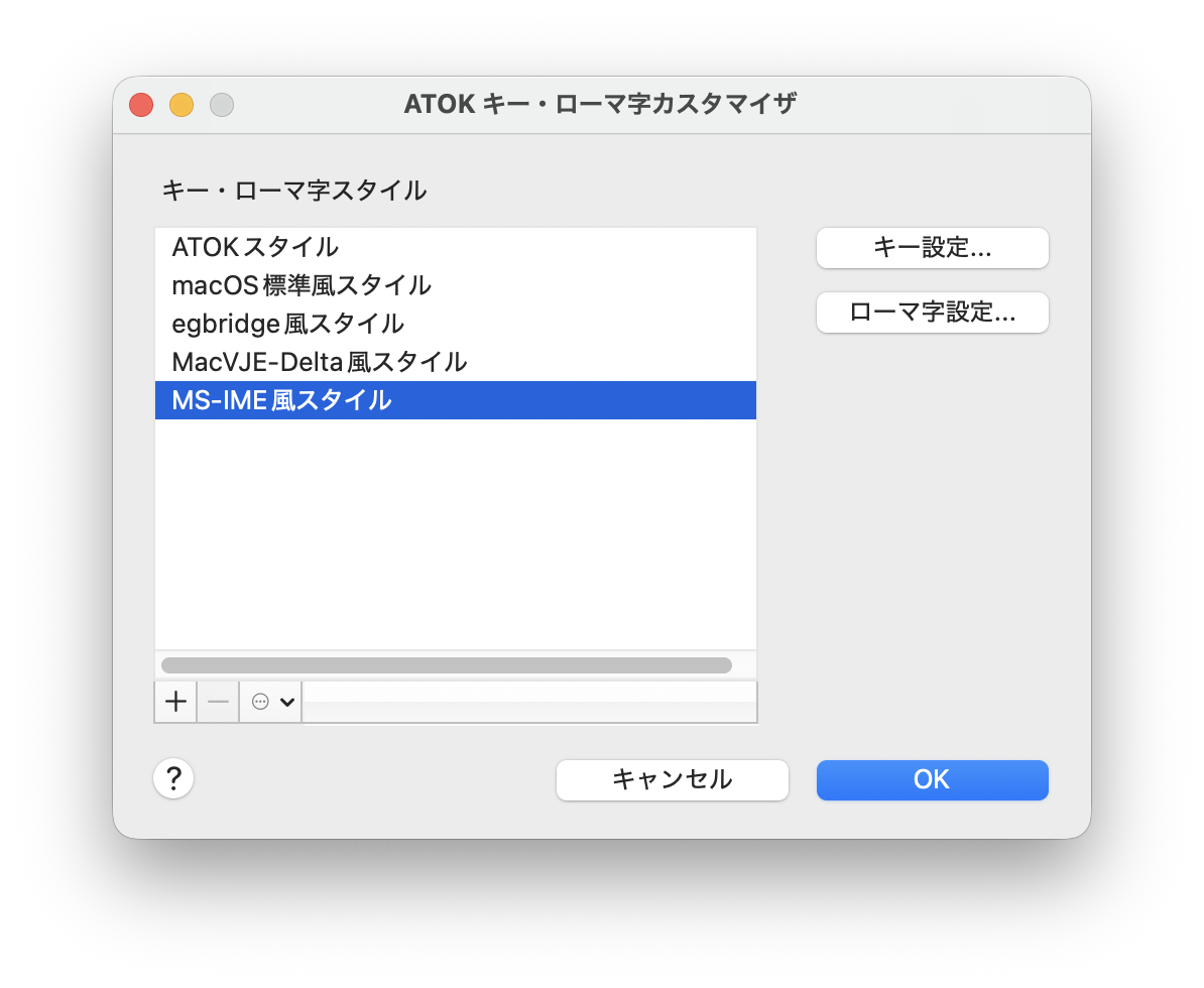 「キー・ローマ字カスタマイザ」の設定が表示されますので「MS-IME風」を選択して「OK」をクリックします。