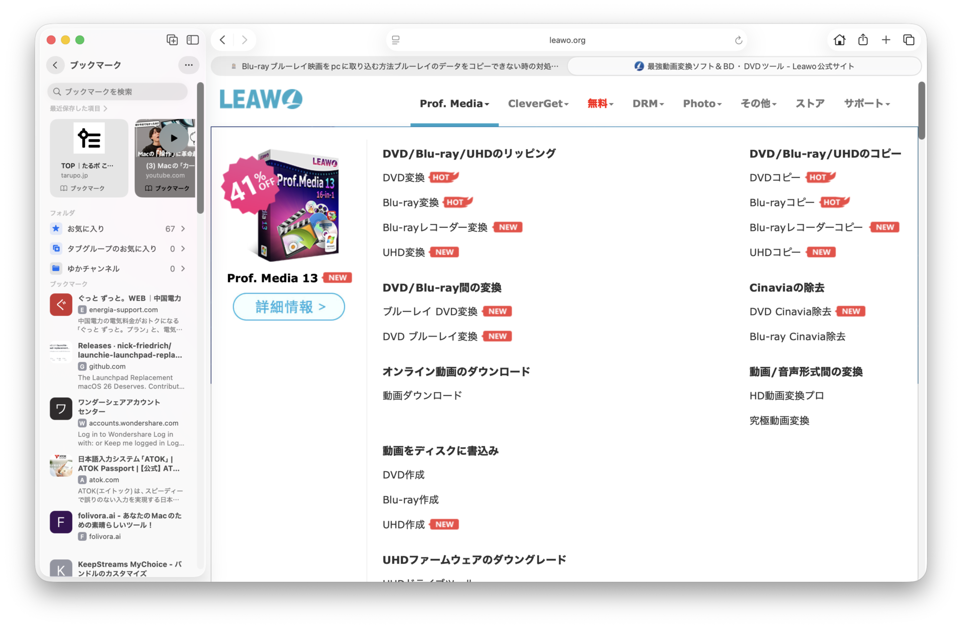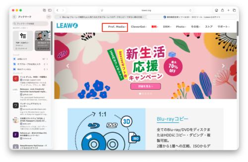 DVDブルーレイbluerayのリッピングコピーデータフォーマット変換ならLEAWのアプリ サイト内検索 macのユーティリティーソフト X Facebook はてブ LINE Pinterest コピー 2026.03.12 こんにちは。 macライフのあんちゃん13です。 DVDブルーレイbluerayのリッピングコピーデータフォーマット変換ならLEAWのアプリをお使いください。 LEAW公式サイトトップ サイトトップページのProf.Mediaにマウスカーソルを併せて下さい。赤枠個所 製品一覧が表示されます。 製品をクリックして下さい。 Bluesky