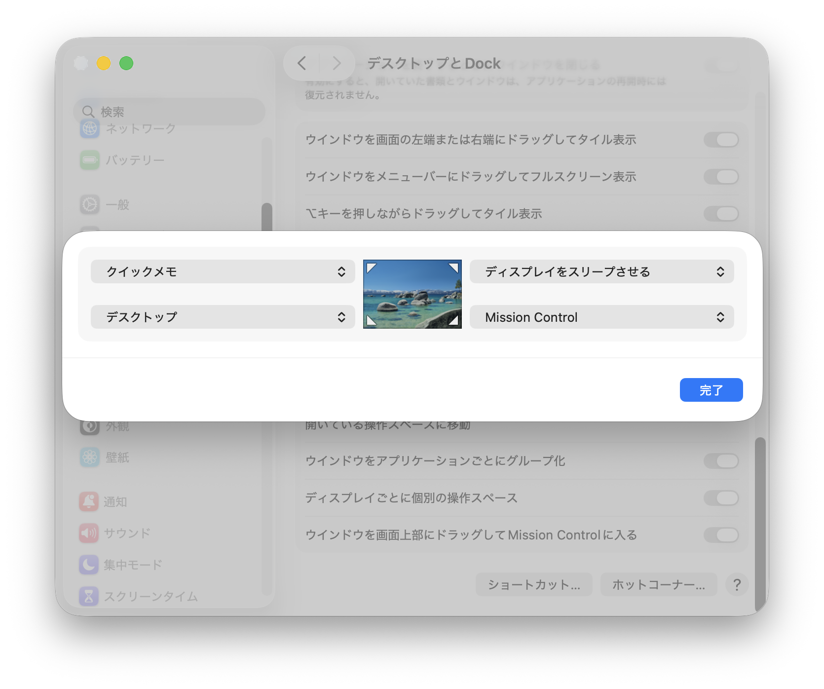 右下、左下、右上、左上に以下のようにアクションを設定して完了ボタンをクリックします。