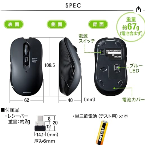 USBレシーバータイプのワイヤレスマウスです。