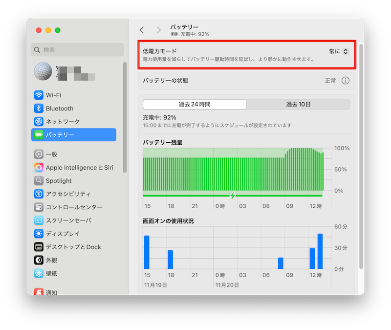 MacBookのバッテリーのアイコンが黄色になっている場合は、低電力モードがオンになっています。