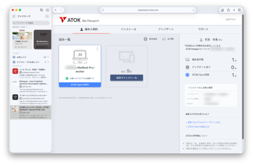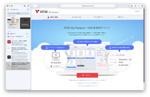 ATOKMYPassportエイトックマイパスポートで分かる情報のご紹介 サイト内検索 日本語入力 2025.10.18 この記事は約1分で読めます。 こんにちは。 macライフのあんちゃん13です。 ATOKMYPassportエイトックマイパスポートのログイン画面 ATOKMYPassportエイトックマイパスポートにログインすると 利用中の端末一覧 インストール可能端末台数 契約内容 シリアルナンバー オンライン登録キー YserID が分かります。 ものは考えようですが、特に控えておかなくてもログインすれば、必要な情報が分かるのは嬉しい Bluesky