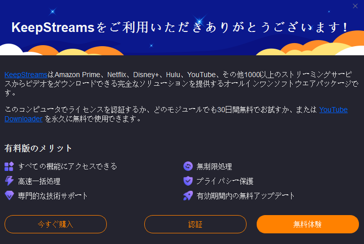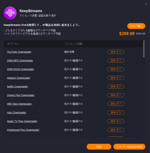 購入画面が表示されますが、右下のオレンジのボタン「スタートKeepStream」のボタンをクリックします。