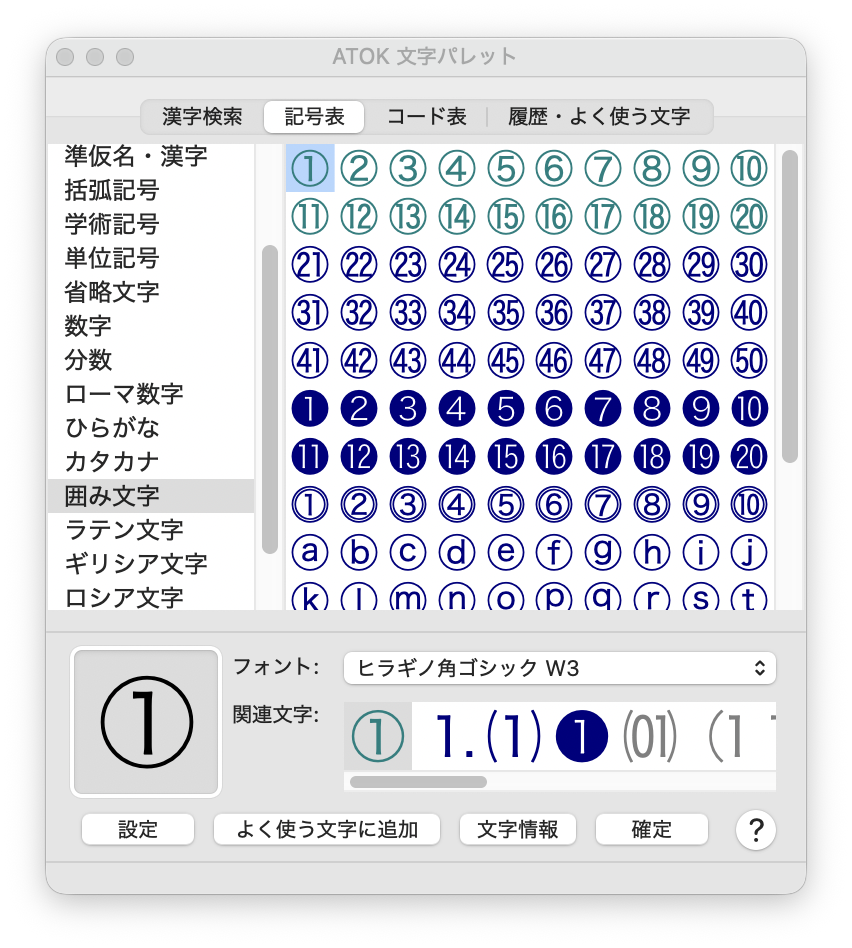 丸数字や記号などを探すときにお役に立ちます。