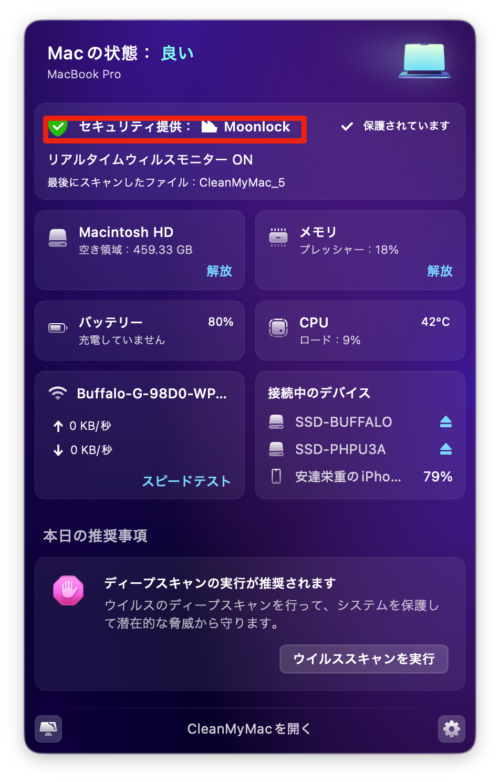 クリーンマイマックCleanMymacクリーンマイマックの常駐ソフトでmacをウイルスから保護しています。