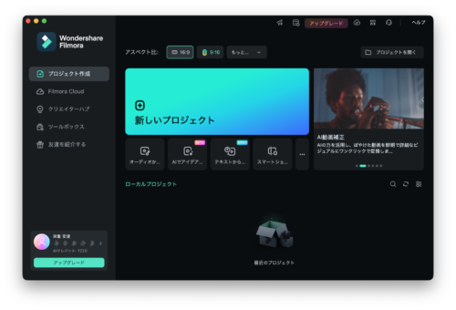 Wondershare Fimora Macを起動するとこんな感じです。